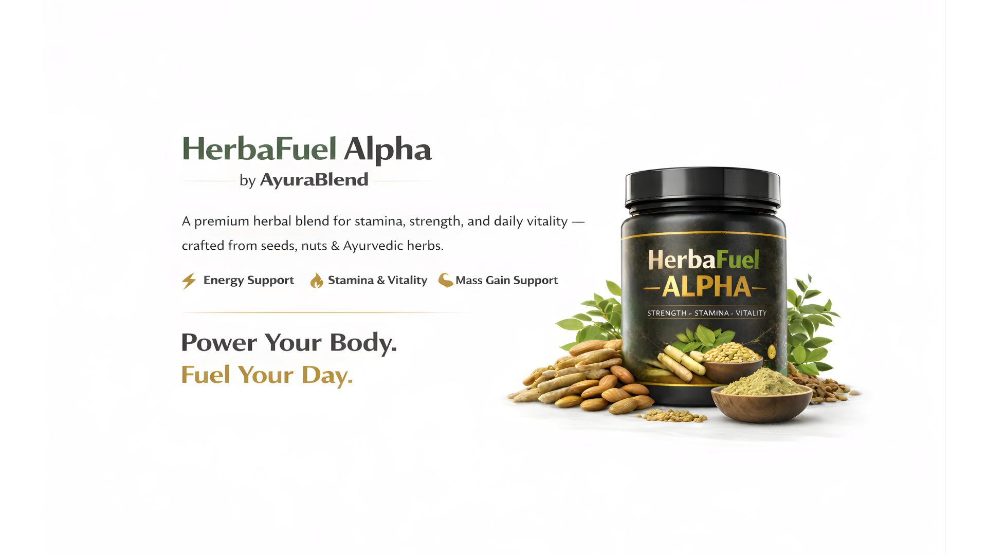 HerbaFuel Alpha is a premium nutritional food supplement crafted from a powerful blend of natural seeds, nuts, and Ayurvedic herbs. It is designed to support sustained energy, strength, stamina, an...